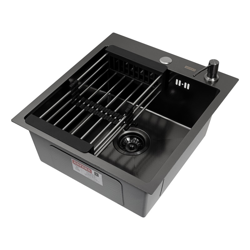 Кухонная мойка Arfeka Eco AR 450*500 Black PVD Nano / Black PVD Nano Decor — с матовым PVD покрытием чаши черного цвета, она безупречно впишется в современный интерьер. Мойка изготовлена из высококачественной нержавеющей стали, хорошо переносящей перепады температур, устойчивой к короззии и появлению царапин. Сливная арматура и крепеж в комплекте.
