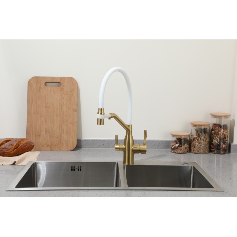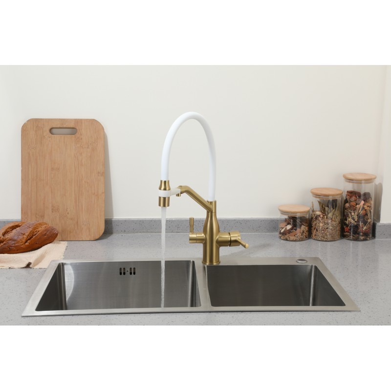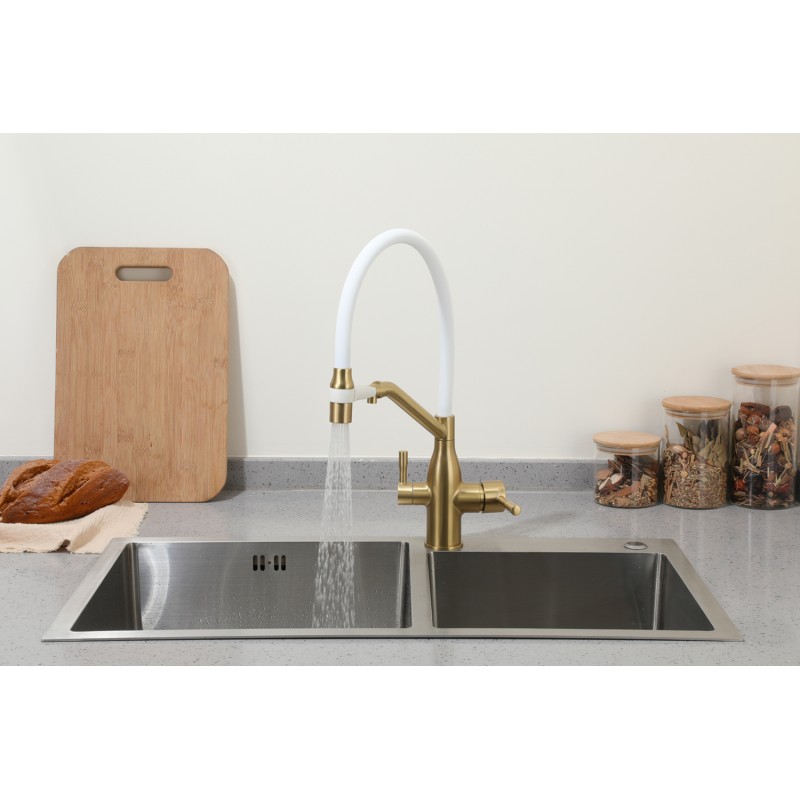 Смеситель для кухонной мойки Frap F4397-3 под фильтр - практичная одно рычажная модель с поворотным на 360 градусов гибким изливом, фиксируемым на магнит, и функцией подключения фильтра питьевой воды. Смеситель оснащен надежным керамическим картриджем 35 mm, выдерживающим высокие нагрузки, и водосберегающим аэратором, позволяющим значительно экономить расход воды. Поток водопроводной воды имеет два режима.