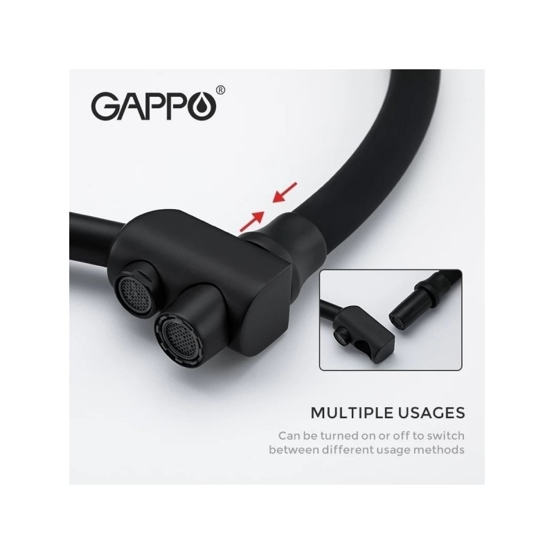 Cмеситель для кухонной мойки Gappo G4398-16 с подключением фильтра питьевой воды - однорычажный смеситель из латуни с отделкой "оружейная сталь" или "черный матовый". Силиконовывй излив фиксируется в держателе, в котором расположен водовод для фильтрованной воды, и легко вынимается из него при необходимости. Смеситель подключается к системе очистки воды.
