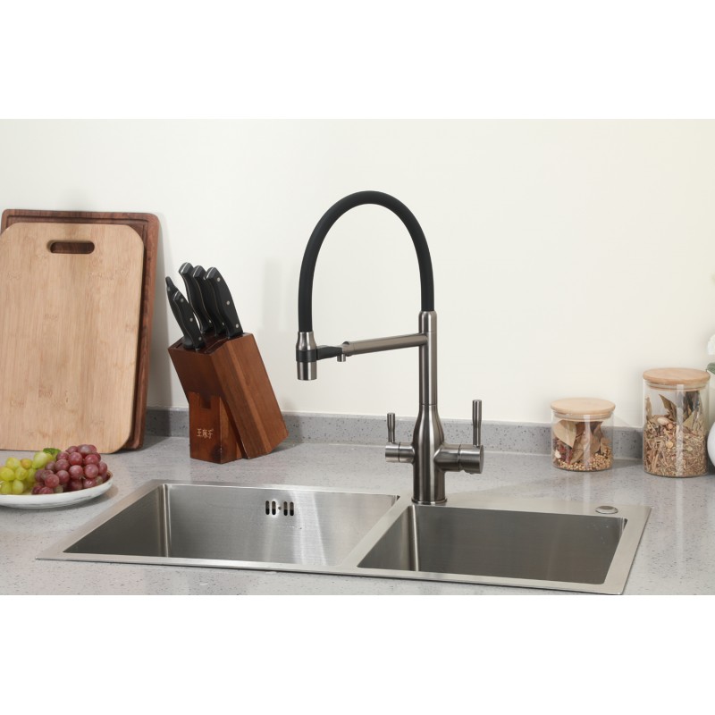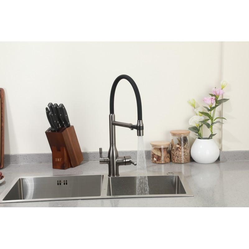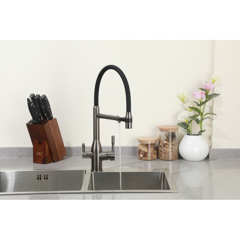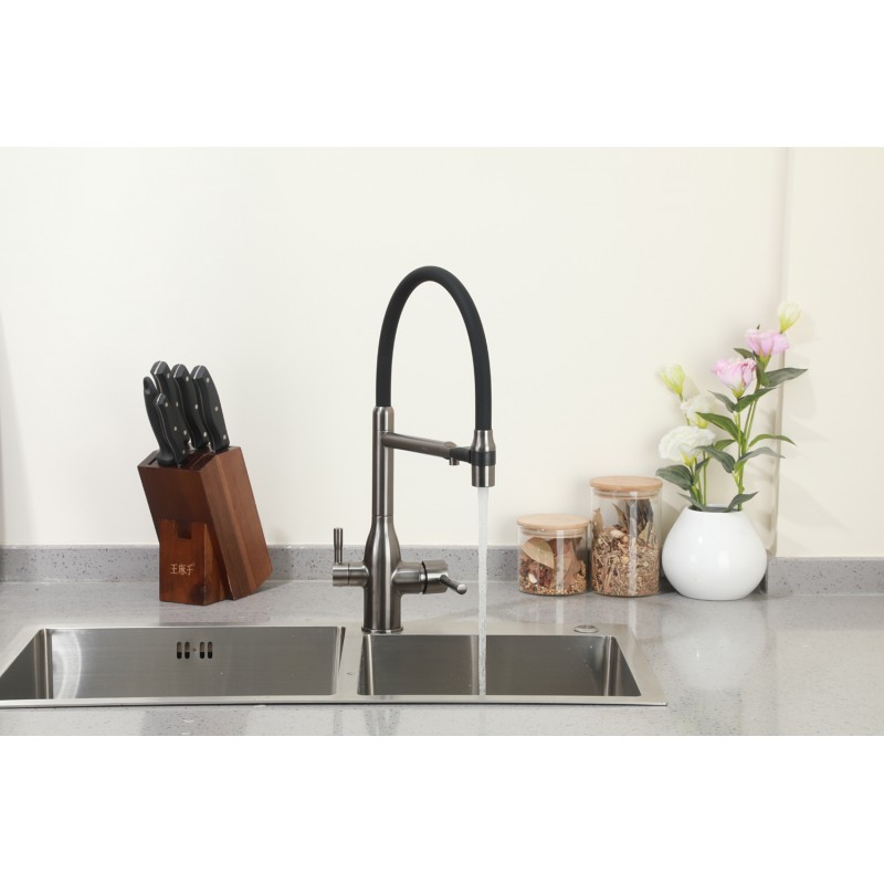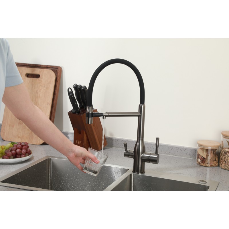 Смеситель для кухонной мойки Frap F4398-9 под фильтр - практичная одно рычажная модель с поворотным на 360 градусов гибким изливом, фиксируемым на магнит, и функцией подключения фильтра питьевой воды. Смеситель оснащен надежным керамическим картриджем 35 mm, выдерживающим высокие нагрузки, и водосберегающим аэратором, позволяющим значительно экономить расход воды. Поток водопроводной воды имеет два режима.