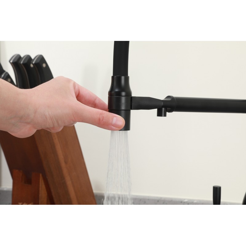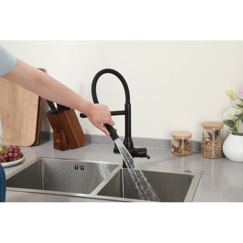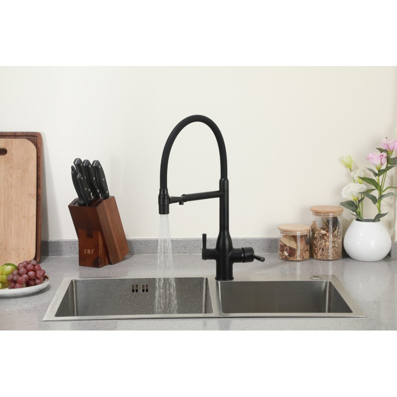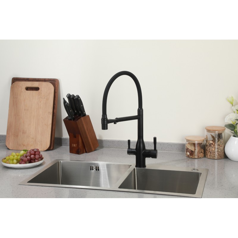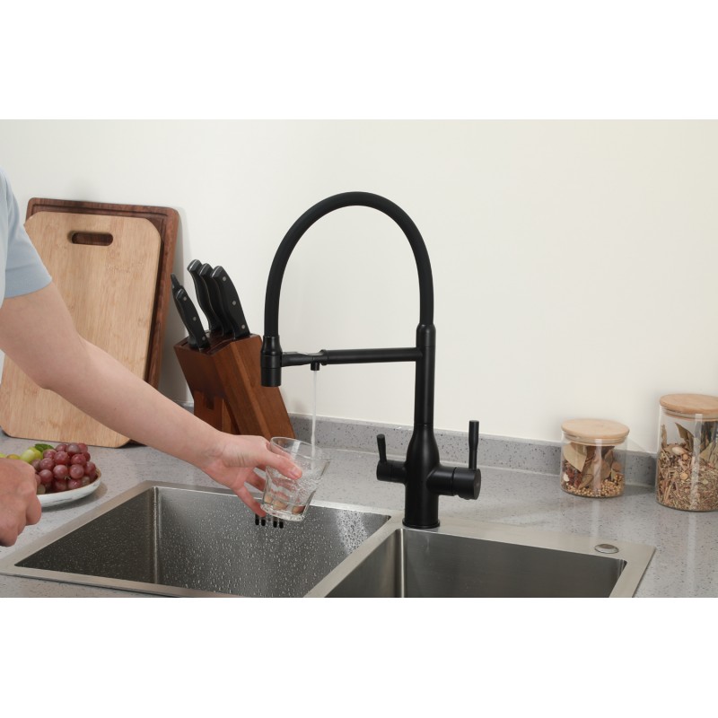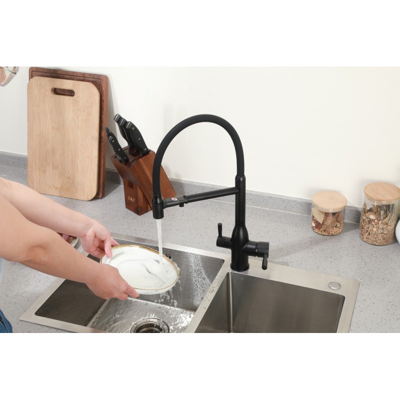 Смеситель для кухонной мойки Frap F4398-6 под фильтр - практичная одно рычажная модель с поворотным на 360 градусов гибким изливом, фиксируемым на магнит, и функцией подключения фильтра питьевой воды. Смеситель оснащен надежным керамическим картриджем 35 mm, выдерживающим высокие нагрузки, и водосберегающим аэратором, позволяющим значительно экономить расход воды. Поток водопроводной воды имеет два режима.