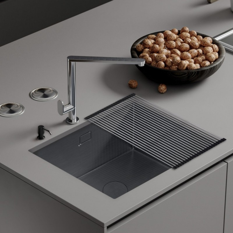 Кухонная мойка Roxen Uno 560210-44B PVD (графит) под столешницу с ролл-матом и дозатором - современная модель в цвете графит с глубокой квадратной чашей, сочетает в себе стильный современный дизайн и отличные эксплуатационные характеристики. Мойка устанавливается под столешницу, комплектуется необходимыми креплениями. Мойка изготовлена из аустенитно низкоуглеродистой стали марки AISI 304, которая обладает устойчивостью к коррозии, окислению и перепаду температур. Отличные шумопоглощающие характеристики мойки обеспечиваются шум подавляющим составом Silent Protection и шумопоглощающими пластинами Soft Silence, которые располагаются по всей чаше мойки.