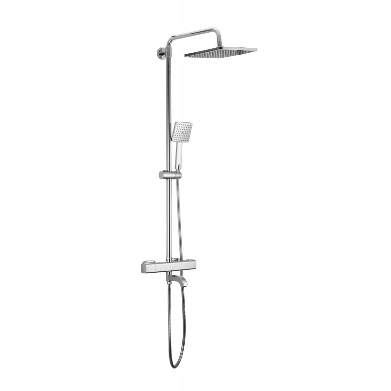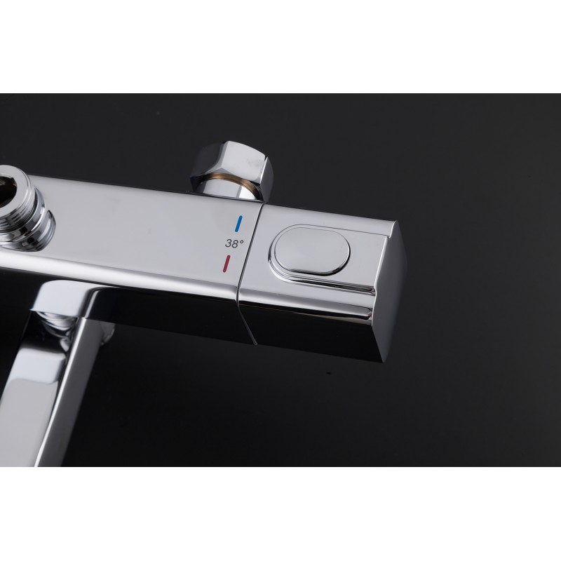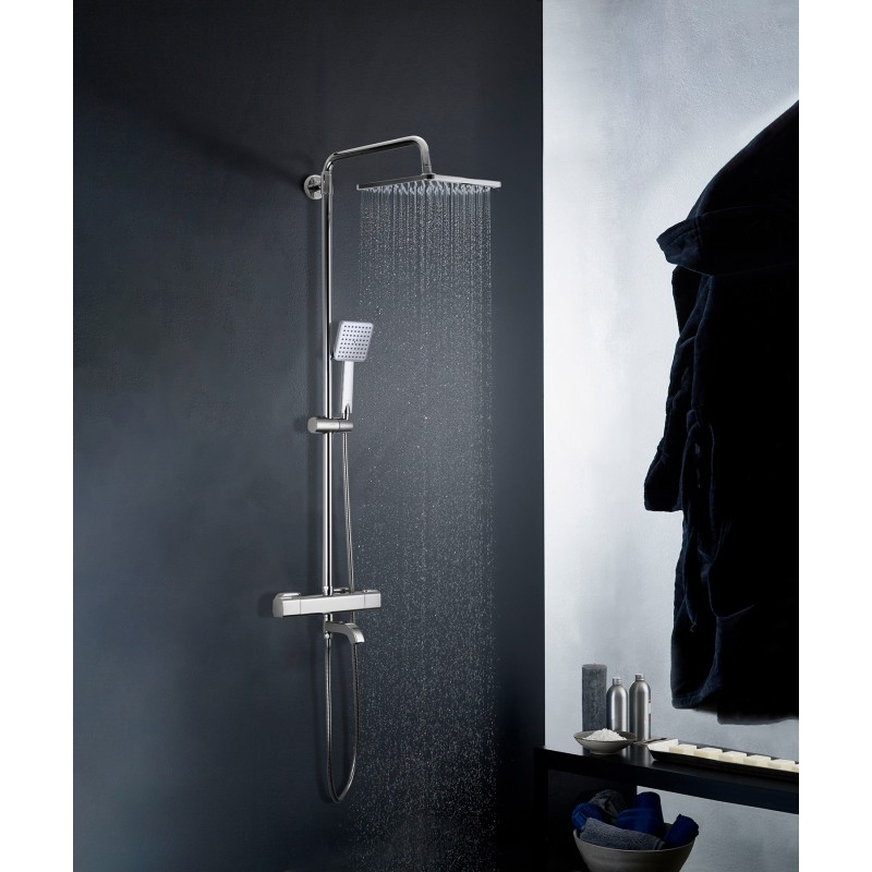 Особенности Высокая штанга:145 смТермостатСмеситель с носом-изливомРегулируемая высота душевой штанги. По принципу телескопической удочки. Части штанги вставляются одна в другую, регулируются по высоте и фиксируются.Рекомендуется установка фильтров грубой очистки воды не более 100 мкр как для холодной, так и для горячей воды.