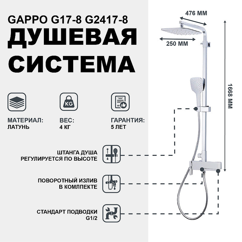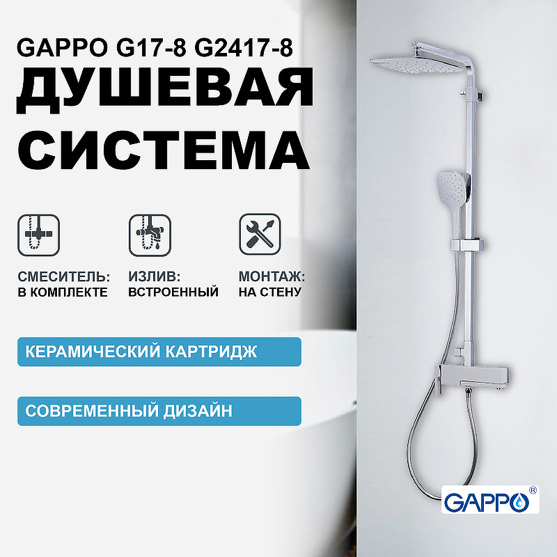 Душевая система GAPPO G2417-8 обладает плавными прямоугольными формами, которые позволяют отнести изделие к современному кубическому стилю. Данная модель стойки, как и другие изделии в данной серии, выполнена из качественной латуни. Этот материал защищает изделие от воздействия влаги, что автоматически продлевает его срок эксплуатации.