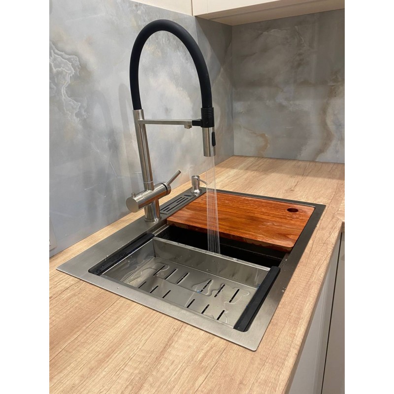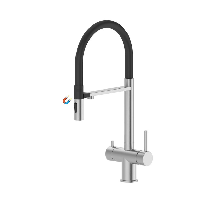 Уникальность данного смесителя — является его многофункциональность. Высокий поворотный гибкий излив на магните, благодаря которому Вы сможете легко заполнить или вымыть емкость больших габаритов или направить струю в трудно доступную часть мойки, что значительно облегчает уход за кухонной мойкой; Возможность подключения фильтра для очистки питьевой воды. Смесители данной коллекции подходят для разных интерьеров и типов моек. Аэратор данного имеет возможность регулировки душ/струя.