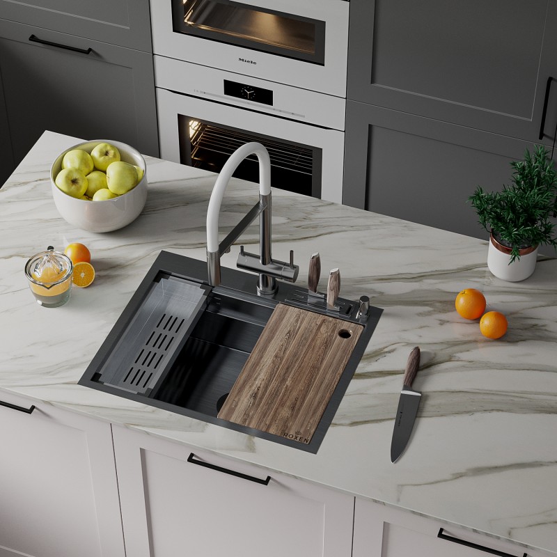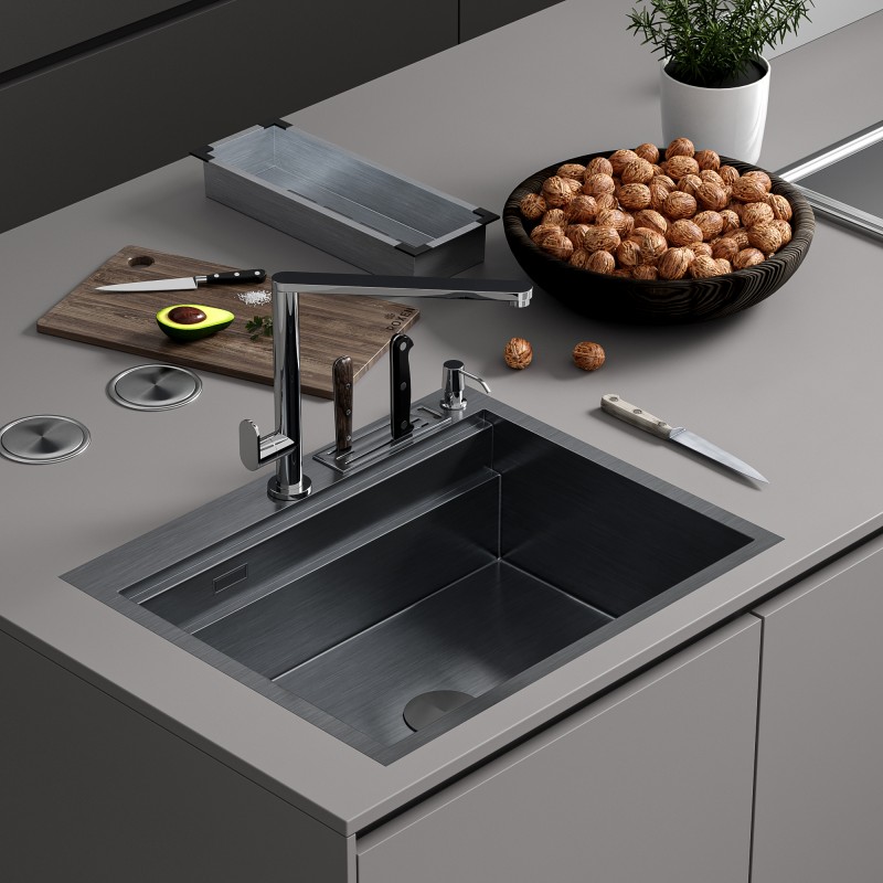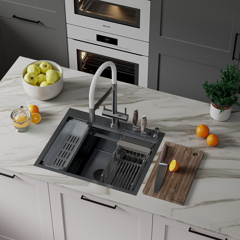Кухонная мойка Roxen Stage 60 PVD (графит) 60х50 с каландром и дозатором в комплекте. Удобная и практичная модель с крылом в цвете графит, сочетает в себе стильный современный дизайн и отличные эксплуатационные характеристики. Мойка изготовлена из аустенит ной низкоуглеродистой стали марки AISI 304, которая обладает устойчивостью к коррозии, окислению и перепаду температур. Уникальное покрытие PVD Tech является защитным слоем, устойчивым к истиранию, появлению царапин и механических повреждений. Отличные шум поглощающие характеристики мойки обеспечиваются шум подавляющим составом Silent Protection и шум поглощающими пластинами Soft Silence, которые располагаются по всей чаше мойки.