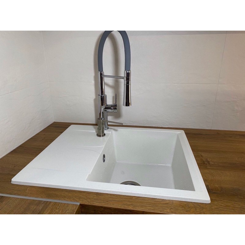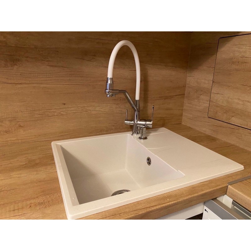 Кухонная мойка Polygran Gals 620 — прямоугольная компактная мойка с глубокой чашей. Покрытие высококачественным гелькоутом создает идеально гладкую поверхность без блеска, а также защищает от перепадов температуры, впитывания загрязнений и преждевременного износа. Мойка укомплектовна сливной арматурой с механическим клапаном из нержавеющей стали. Дополнительно можно приобрести смеситель для кухонной мойки Polygran с покрытием из искусственного гранита. Смеситель можно установить справа, слева или по центру бортика.