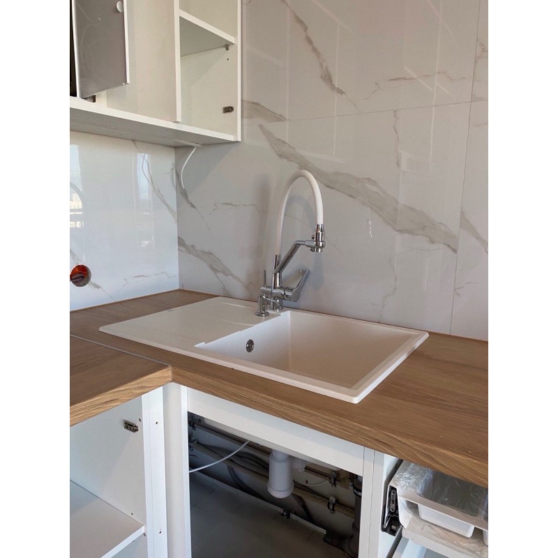 Кухонная мойка Polygran Gals 760 — прямоугольная компактная мойка с глубокой чашей. Покрытие высококачественным гелькоутом создает идеально гладкую поверхность без блеска, а также защищает от перепадов температуры, впитывания загрязнений и преждевременного износа. Мойка укомплектовна сливной арматурой с механическим клапаном из нержавеющей стали. Дополнительно можно приобрести смеситель для кухонной мойки Polygran с покрытием из искусственного гранита. Смеситель можно установить справа, слева или по центру бортика.